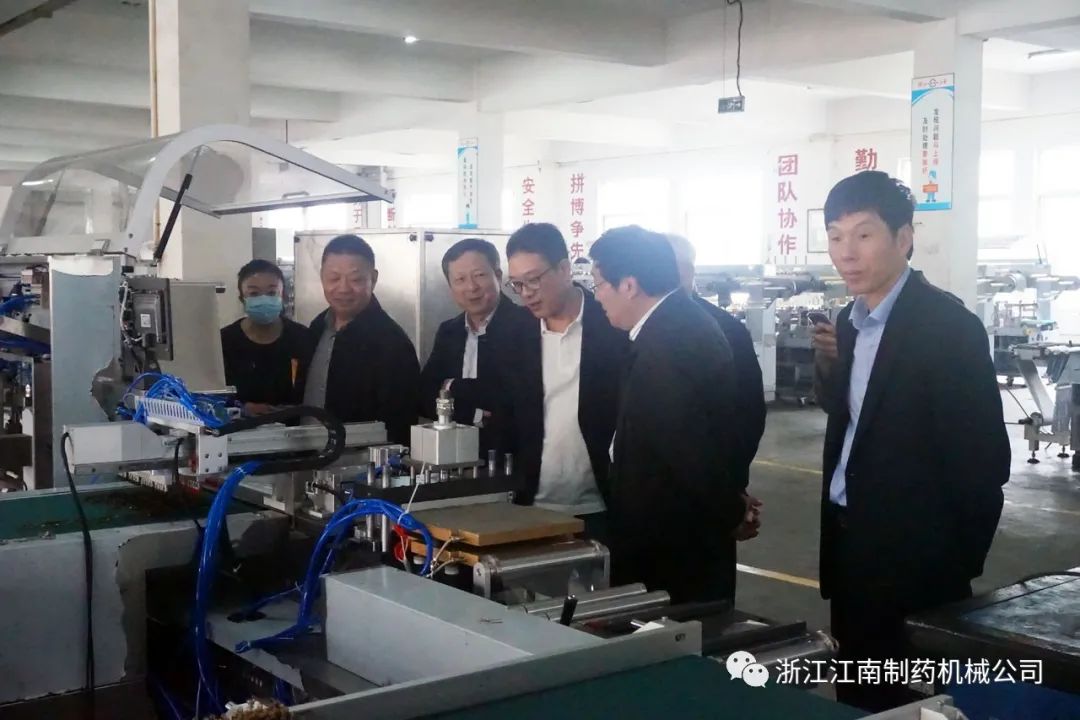 杨松董事长接待陈秘书长等一行,陪同来访领导走进公司铝塑泡罩包装机车间、高效智能包衣机车间、药品包装自动生产线车间以及成品展示车间。